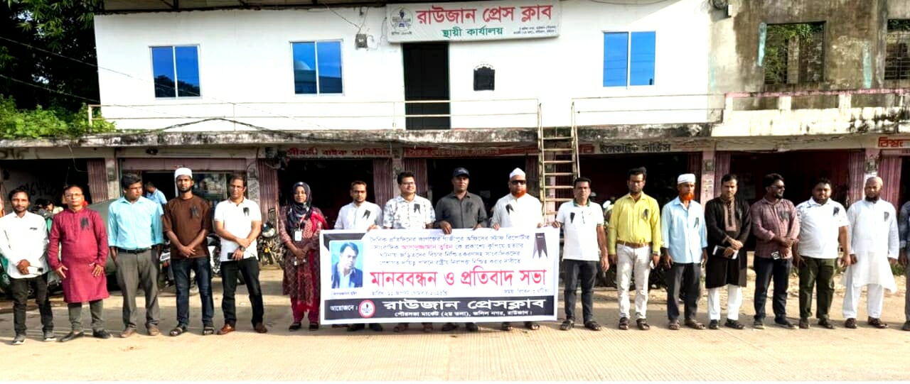 নেজাম উদ্দিন রানা, রাউজান (চট্টগ্রাম):গাজীপুরে দৈনিক প্রতিদিনের কাগজ পত্রিকার স্টাফ রিপোর্টার আসাদুজ্জামান তুহিনকে প্রকাশ্যে কুপিয়ে হত্যার প্রতিবাদে রাউজান প্রেসক্লাবের উদ্যোগে প্রতিবাদ সভা ও মানববন্ধন কর্মসূচি পালন করা হয়েছে। সোমবার, ১১ আগস্ট বিকালে রাউজান জলিল নগরে রাউজান প্রেসক্লাবের স্থায়ী কার্যালয়ে প্রতিবাদ সভা শেষে চট্টগ্রাম-রাঙামাটি সড়কে মানববন্ধন কর্মসূচি পালন করা হয়। এই কর্মসূচীতে সাংবাদিক তুহিন হত্যাকাণ্ডে জড়িতদের বিচার নিশ্চিতকরণসহ সাংবাদিকদের পেশাগত দায়িত্ব পালনে রাষ্ট্রীয় নিরাপত্তা নিশ্চিত করার দাবী জানানো হয়। এতে সভাপতিত্ব করেন রাউজান প্রেসক্লাবের সভাপতি এম বেলাল উদ্দিন। সাধারণ সম্পাদক নেজাম উদ্দিন রানার সঞ্চালনায় বক্তব্য রাখেন সাবেক সভাপতি প্রদীপ শীল, সাবেক সাধারণ সম্পাদক এম জাহাঙ্গীর নেওয়াজ, সাবেক সাধারণ সম্পাদক এসএম ইউসূফ উদ্দিন, সিনিয়র সহ-সভাপতি এম রমজান আলী, সহ-সভাপতি সাহেদুর রহমান মোরশেদ, সাবেক সহ-সভাপতি জিয়াউর রহমান, সহ-সভাপতি মো. হাবিবুর রহমান, সহ-সভাপতি যীশু সেন, সাবেক যুগ্ম সম্পাদক কামাল উদ্দিন হাবিবী, যুগ্ম সম্পাদক লোকমান আনছারী, সহ সাধারণ সম্পাদক শাহাদাত হোসেন সাজ্জাদ, সাংগঠনিক সম্পাদক আবিদ মাহমুদ, দপ্তর সম্পাদক রতন বড়ুয়া, এয়াছিন শাহ পাবলিক কলেজের শিক্ষক ইয়ার মোহাম্মদ, প্রবাসী মো. হারুন, সংবাদকর্মী মোহাম্মদ জুয়েল সিকদার,