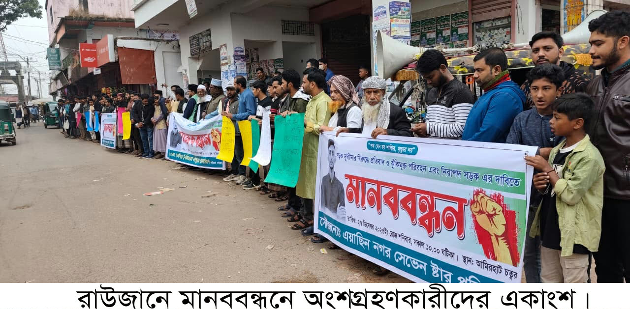 নেজাম উদ্দিন রানা, রাউজান (চট্টগ্রাম):চট্টগ্রামের রাউজানে সড়ক দুঘটনায় কলেজছাত্র জাবেদ আলম নিহতের পর ফিটনেসবিহীন যানবাহন চলাচল বন্ধসহ নিরাপদ সড়কের দাবিতে মানববন্ধন করেছেন স্থানীয় জনসাধারণ। ২৭ ডিসেম্বর শনিবার সকালে রাউজান উপজেলার হলদিয়া ইউনিয়নের আমীরহাট বাজারে হাফেজ বজলুর রহমান সড়কের পাশে এই মানববন্ধন কর্মসূচী পালন করা হয়। সর্বস্তরের জনসাধারণের ব্যানারে আয়োজিত মানববন্ধনে বিএনপি, আহলে সুন্নাত ওয়াল জামাত, গাউসিয়া কমিটি, গফুর শাহ (রা.) নবীন সংঘ এয়াছিন নগর সেভেন স্টার পরিষদ সহ বিভিন্ন রাজনৈতিক ও সামাজিক সংগঠনের নেতৃবৃন্দসহ বিভিন্ন শ্রেণী পেশার লোকজন অংশগ্রহণ করেন। এসময় আমরা আর কোন জাবেদকে হারাতে চাইনা, সড়কে হত্যার বিচার চাই, পথ যেন হয় শান্তির মৃত্যুর নয়, সড়কের শৃঙ্খলা আনুন, জীবন বাচারসহ নানা লেখা সম্বলিত প্ল্যাকার্ড শোভা পায় মানববন্ধনে অংশগ্রহণকারীদের হাতে। গফুর শাহ নবীন সংঘের সাধার সম্পাদক মাওলানা রাশেদ রেজার সঞ্চালনায় স্বাগত বক্তব্য রাখের সমাজসেবক গিয়াস উদ্দিন সিকদার। প্রবীণ রাজনীতিবীদ সৈয়দ কামাল উদ্দিনের সভাপতিত্বে বক্তব্য রাখেন রাজনীতিবীদ নরুল ইসলাম, মুরশেদ রেজা, আলমগীর হোসেন, ইঞ্জিনিয়ার মো. ইলিয়াস, গফুর শাহ নবীন সংঘের সভাপতি সৈয়দ আহমদ রেজা, সাংবাদিক দিদারুল আলম, গাউছিয়া কমিটির সভাপতি শাহ আলম, সেভেন স্টার পরিষদের সংগঠক মুহাম্মদ মারুফ উদ্দিন রানা, সড়ক দুর্ঘটনায় নিহত কলেজছাত্র জাবেদ আলমের বড় ভাই মুহাম্মদ জাহেদ আলম। এসময় উপস্থিত ছিলেন জিয়াউল কাদের আলিফ, আসিফ তানভীর, মুহাম্মদ ইসমাইল হোসেন, মুহাম্মদ শারুফ, মনির উদ্দিন, আবু নাছের, তানজিদ মুস্তাফা, সাগর, শাফিন, সাকিব, আজিজ খান, সাবের, শাহেদ, আপ্পান, মাসুম। মোনাজাত পরিচালনা করেন রাশেদ রেজা। মানবন্ধন শেষে সম্প্রতি সড়ক দুর্ঘটনায় নিহত জাবেদ আলমের কবর জেয়ারত ও পুষ্পমাল্য অর্পণের মাধ্যমে শ্রদ্ধা নিবেদন করা হয়।