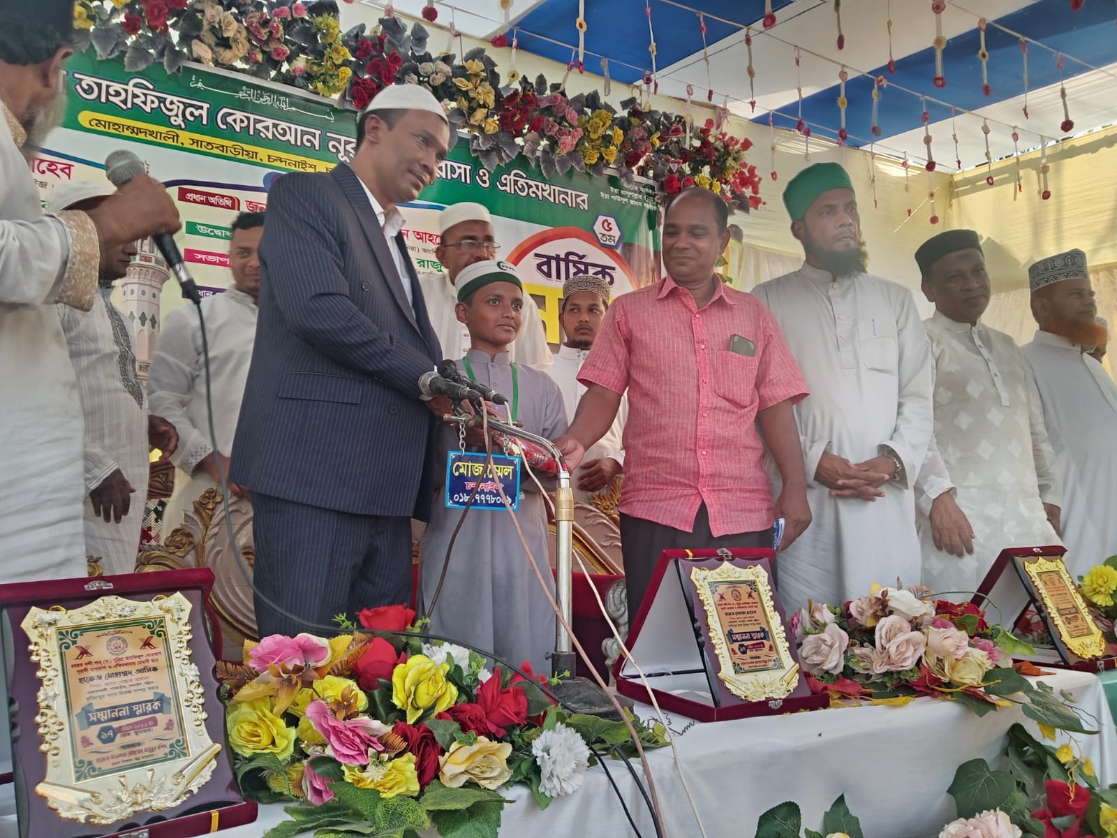 অনুষ্ঠানের শেষে প্রধান অতিথি মাদ্রাসার বিভিন্ন প্রতিযোগিতায় উত্তীর্ণ শিক্ষার্থীদের মাঝে ক্রেস্ট বিতরণ করেন। পাশাপাশি মসজিদ, মাদ্রাসা ও এতিমখানার বিভিন্ন সমস্যা ও সম্ভাবনার কথা মনোযোগ দিয়ে শুনে তা সমাধানের আশ্বাস প্রদান করেন।