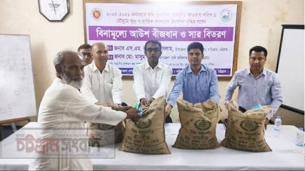 চট্টগ্রামের রাউজানে ২০২৫-২০২৬ অর্থবছরে কৃষি পুনর্বাসন কর্মসূচীর আওতায় খরিপ-১মৌসুমে ক্ষুদ্র ও প্রান্তিক কৃষকদের উৎপাদন বৃদ্ধির লক্ষ্যে বিনামূল্যে আউশ বীজধান ও সার বিতরণ করা হয়েছে।